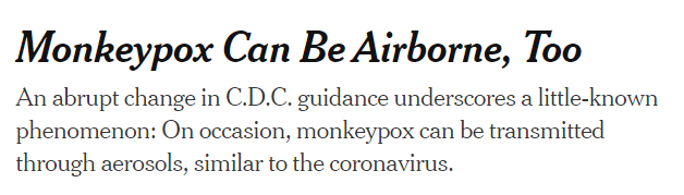 《紐約時報》稱,這一轉變提示我們當前猴痘爆發過程中很少被討論的一個方面:病毒可以通過空氣傳播,至少在短距離內可通過空氣傳播。專家在採訪中稱,儘管空氣傳播在整體傳播過程中只是一個很小的因素,但目前對它的影響還沒有確切的估計。