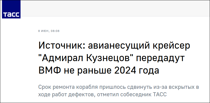 據俄羅斯塔斯社報道,俄國防工業綜合體的一名消息人士當地時間週三(8日)透露,由於工作過程中發現的缺陷問題,俄羅斯唯一一艘航母“庫茲涅佐夫”號的維修期不得不再次推後數月。