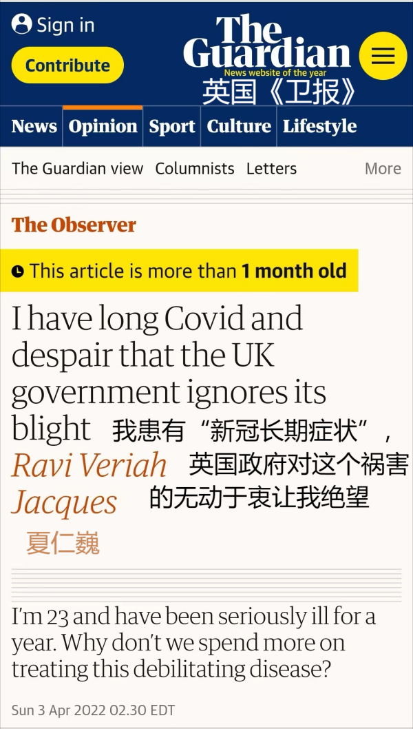 抱歉有點扯遠了,説回到我自己。我先是感染了新冠病毒,然後2021年3月的一天我突然覺得疲憊不堪,這種感覺前所未有。一開始我沒想到和新冠病毒有關,我逐漸注意到自己的其它症狀,比如短暫失去嗅覺和味覺,還有一些和新冠患者常見症狀類似的情況。