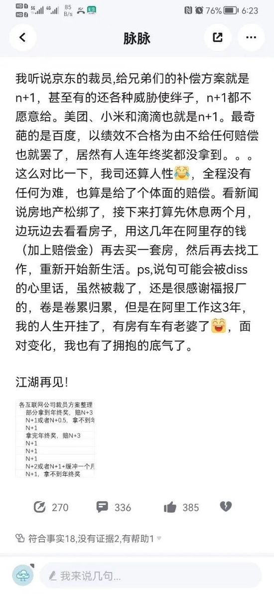 該員工還曬出一份“各互聯網公司裁員方案整理”的表格,根據該表,相比其它幾家大廠,阿里的“拿完年終獎,賠N+3”方案如該員工所説“還算良心”。
