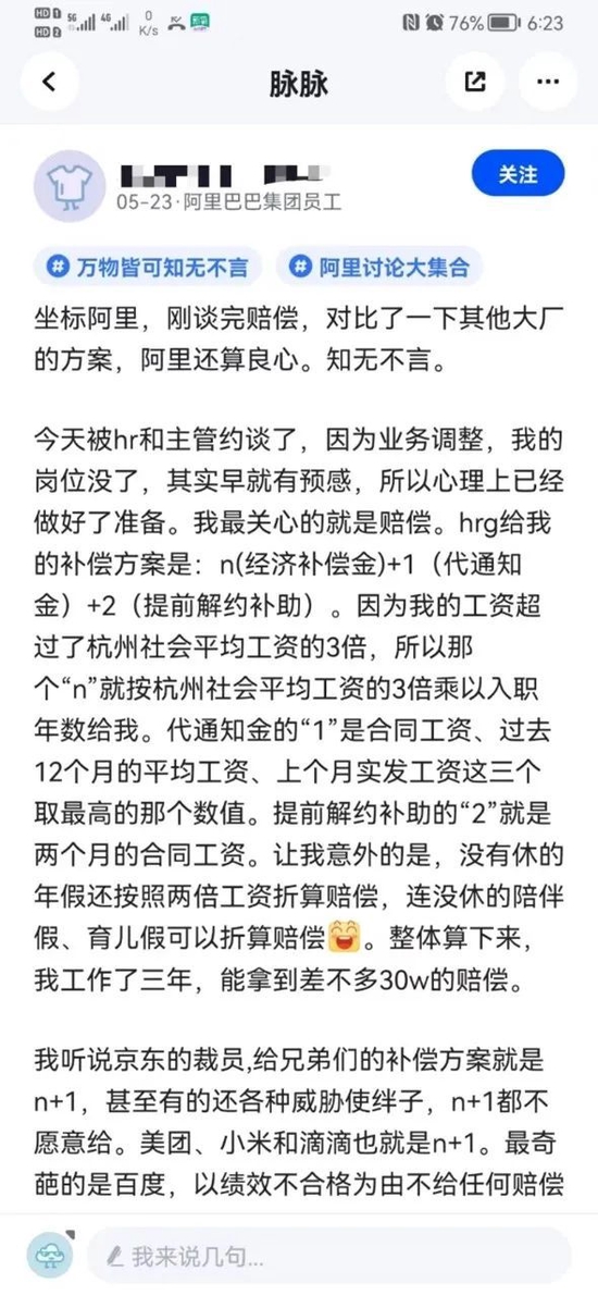 有阿里員工發文稱,“今天被約談了,這週五走N+3,緩衝29天是N+1,去年的校招生,目前手裏沒offer,正在面試”。該員工還糾結是再待一個月還是拿n+3走人。還有員工發文證實阿里裁員N+3,並稱和之前流傳消息不同的是,最後期限提前到週三以及沒有次月社保。