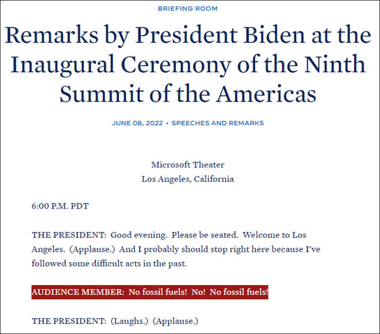 另外,白宮網站8日公佈的拜登美洲峯會講話摘要,也記錄下了會場中抗議者的喊話——“觀眾:不要化石燃料!不!不要化石燃料!”
