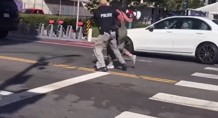 據美國福克斯新聞(Fox News)9日報道,這名女子拿着一隻喇叭闖進了一條被封鎖的道路上,接近拜登的車隊。在她試圖攔車時,一名特勤局官員迅速上前將她帶離,並在路邊將女子撂倒在地。之後,該女子不斷反抗,卻被這名特勤局官員直接打了一巴掌。