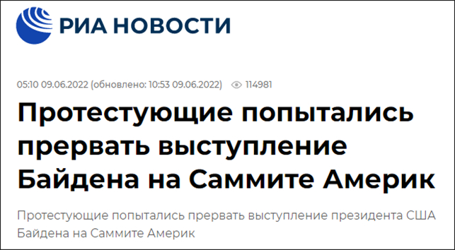 據俄新社9日報道,主持美洲峯會開幕式的拜登在演講剛一開始,有抗議者就大叫着打斷他,拜登只能以短暫的停頓和微笑回應。之後,抗議者被現場安保人員帶離大廳,拜登繼續演講,沒再被打斷。