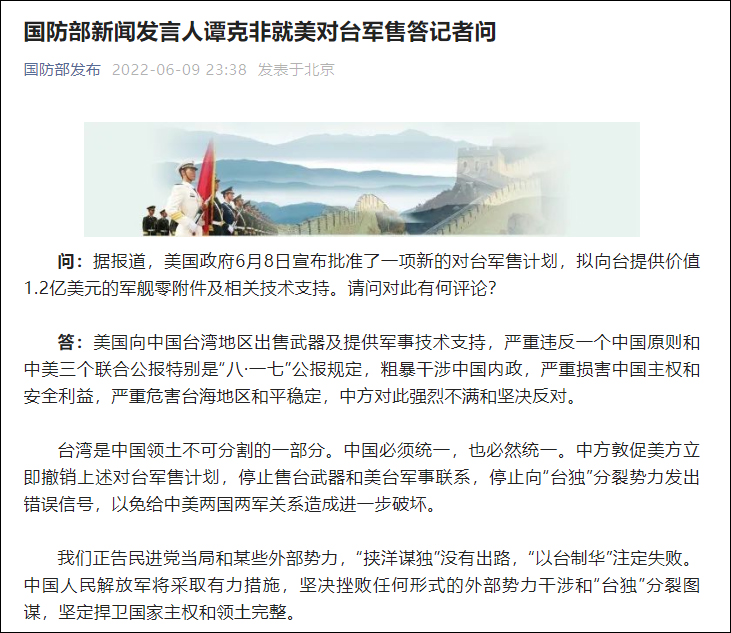 問:據報道,美國政府6月8日宣佈批准了一項新的對台軍售計劃,擬向台提供價值1.2億美元的軍艦零附件及相關技術支持。請問對此有何評論?