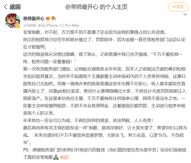 孫自烜稱,去年年底收到税務部門通知,讓其配合調查, “因本人之前税法方面的意識和相關知識極其匱乏,當時並不知道每個主播都要主動申報45%的個人勞務所得税,這事只能怪自己無知吧。”
