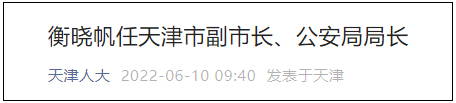 據微信公眾號“天津人大”消息,6月10日,天津市第十七屆人民代表大會常務委員會第三十五次會議決定任命衡曉帆為天津市副市長、公安局局長。