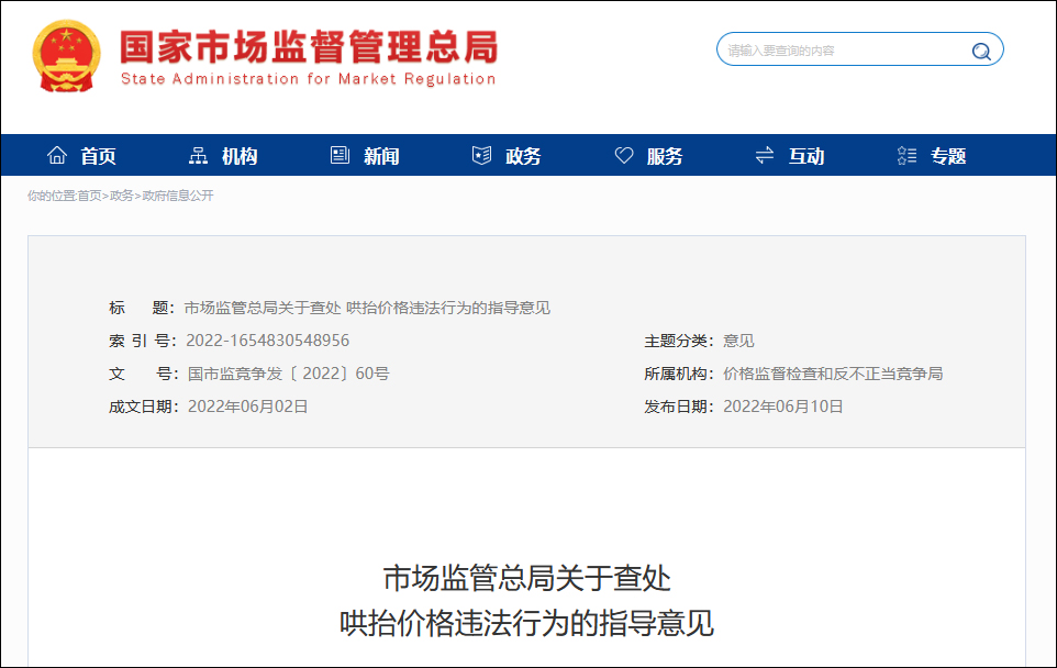 6月10日,國家市場監督管理總局發佈《關於查處哄抬價格違法行為的指導意見》,對於捏造散佈生產、進貨成本信息的、貨源緊張或者市場需求激增信息的、其他經營者已經或者準備提價信息的,以及在銷售商品過程中,強制搭售商品,變相大幅度提高商品價格,市場監管部門均可認定構成哄抬價格違法行為。