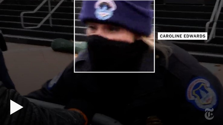 在特朗普的支持者衝過路障、衝進國會大廈時,國會警察卡羅琳·愛德華茲(Caroline Edwards)是第一個受傷的執法人員。她在當天的聽證會上描述了自己最初是如何在大樓外的警戒線上與抗議者們對峙的。最後,抗議者用自行車架把她壓在地上,把她打暈。
