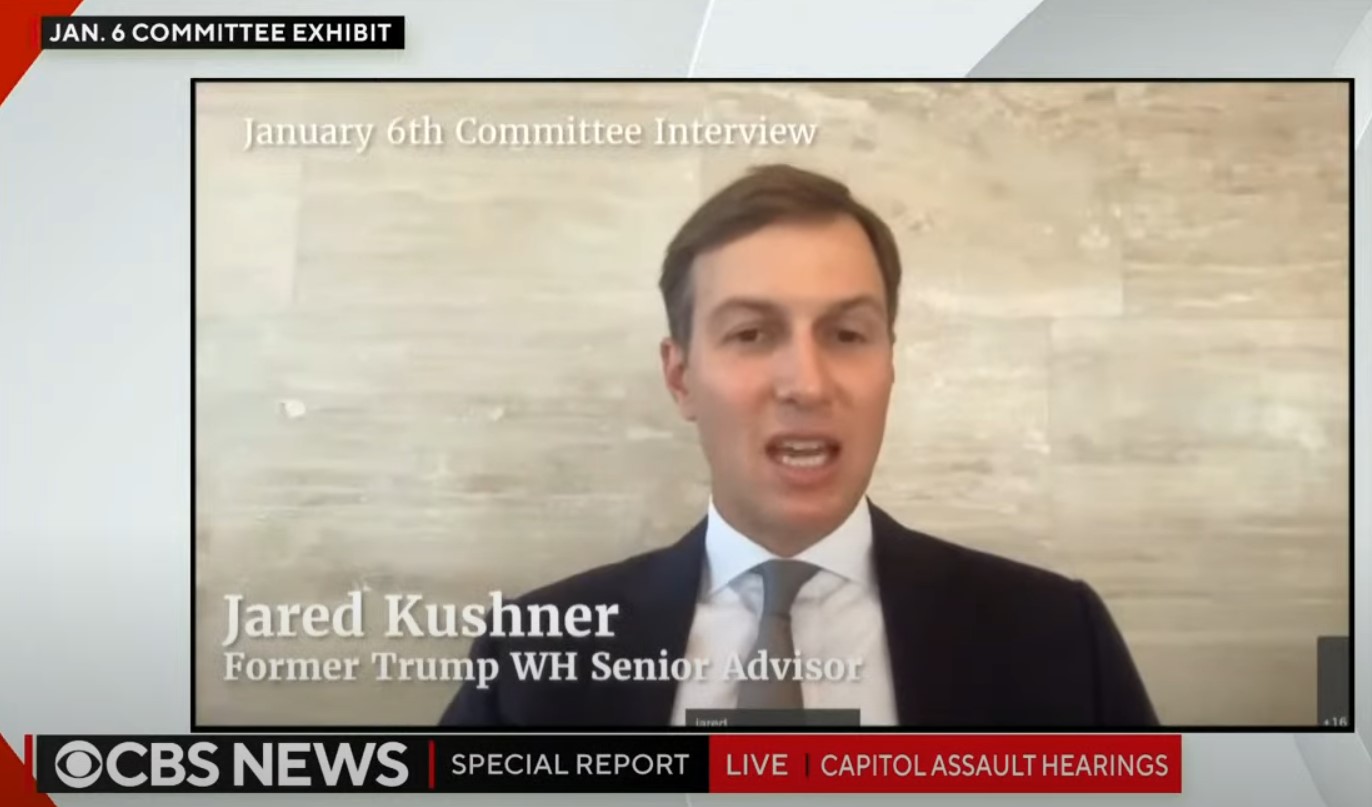 視頻顯示,切尼親自向前總統的女婿兼顧問庫什納詢問,特朗普的律師是否因為他的虛假選舉聲明而威脅辭職。庫什納表示自己並未當回事:“他和他的團隊總是在説,‘哦,我們要辭職了,如果發生了這種事,如果發生了那種事,我們就不會在這裏了。’所以説實話,我只是覺得這是在抱怨。”