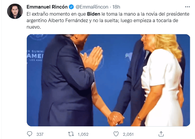 西班牙語英語雙語媒體ElAmerican的編輯Emmanuel Rincón在推特發文稱:“奇怪的時刻:拜登拉着阿根廷總統女友的手不放,他後來又開始撫摸她。”