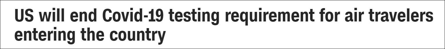 美疾控中心(CDC)在10日晚些時候的聲明中宣佈已經撤銷了之前需要新冠檢測陰性證明的要求,並稱“新冠肺炎大流行已進入新階段”。