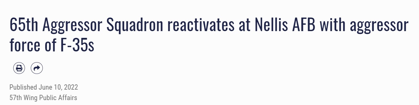 此前從2005年起,第65“入侵者”中隊開始使用F-15戰鬥機進行潛在對手的技戰術模擬,但由於預算緊張原因,於2014年解散。直到2019年5月9日,為應對五代機的挑戰,美國空軍才宣佈計劃用F-35閃電II戰鬥機重組第65“入侵者”中隊,並在今年6月9日正式重新組建。