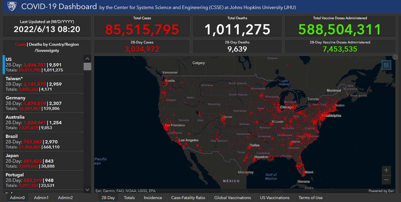 (觀察者網訊)根據美國約翰斯·霍普金斯大學統計數據,截至北京時間6月13日8時20分,美國新冠肺炎累計感染病例達到85515795例,累計死亡病例達到1011275例。在過去約24小時裏,美國新增確診病例14819例,新增死亡病例15例。