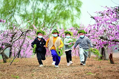 小朋友在臨沂市郯城縣馬頭鎮“農家花園”裏玩耍。房德華攝/光明圖片