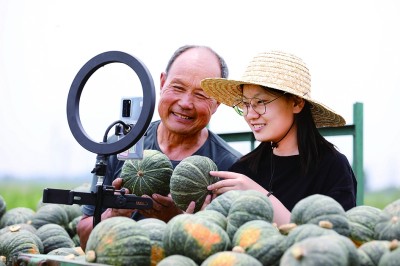 臨沂財經學校的學生和沂南縣湖頭鎮農民一起直播銷售南瓜。杜昱葆攝/光明圖片