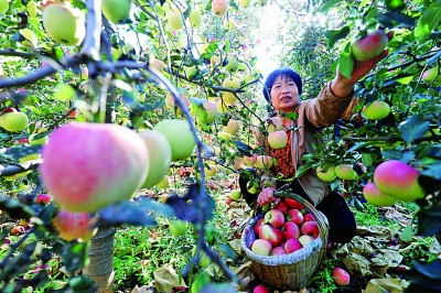 河北井陘縣孫莊鄉洛陽村,果農正在收穫蘋果。樑子棟攝/光明圖片