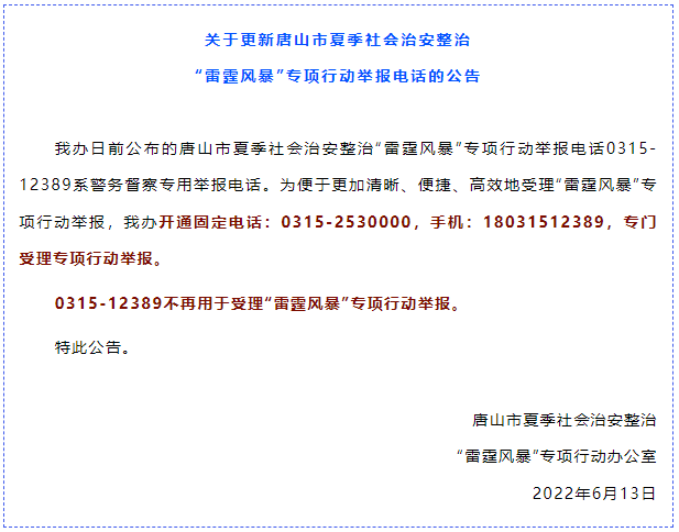 6月13日,“唐山發佈”微信公眾號發佈關於更新唐山市夏季社會治安整治“雷霆風暴”專項行動舉報電話的公告。