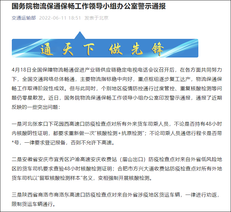 6月11日,交通運輸部發布了《國務院物流保通保暢工作領導小組辦公室警示通報》,通報了近期反映的一些突出問題。隨後,被通報的省份迅速開始了整改。