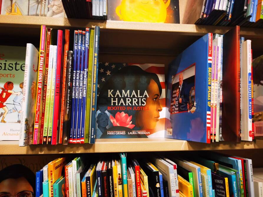就制度認同而言,則是從孩子們最容易感受到的國家節日入手來介紹美國的歷史和文化,並逐步引入至關重要的政治人物。不僅教材如此安排,就是課外閲讀書籍,也並不迴避突出政治人物的正面作用。下面這張圖中間的畫冊講的就是當今副總統哈里斯的成長經歷。
