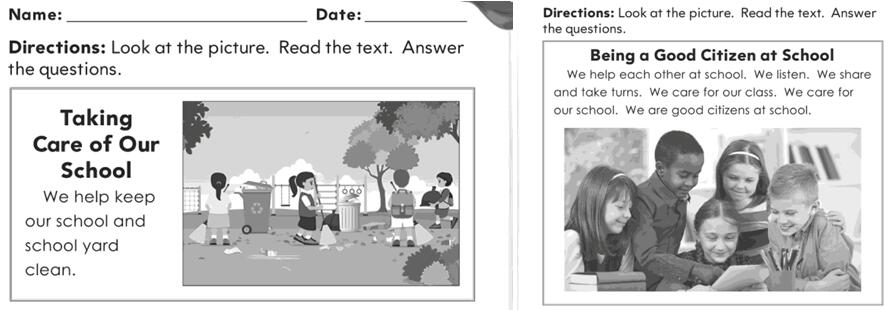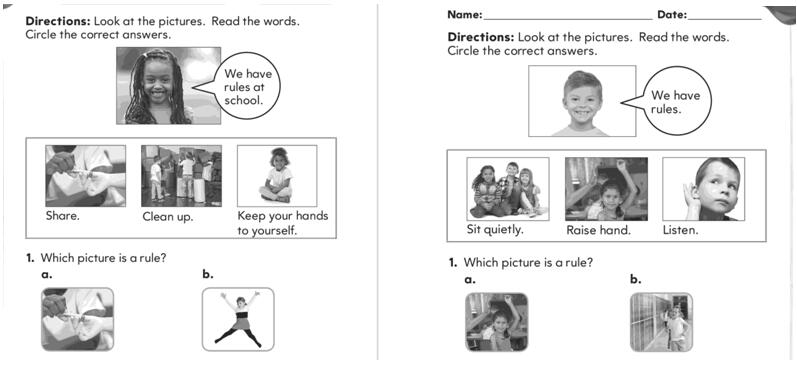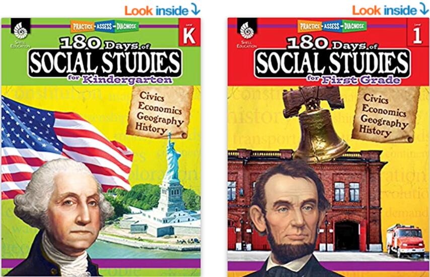 除了在國家意識建構中保留甚至突出宗教因素,美國還通過教材很早就開始進行制度認同教育和行為建構。美國小學階段的課程設置大致可以分為英語、數學、計算機、科學、社會研究、以及體育和音樂。社會研究裏面又涵蓋公民教育、經濟、地理和歷史,是完成意識建構功能中最重要的部分。以下幾張圖片來自於亞馬遜網站出售的練習冊,一本供5歲學前班的孩子使用,一本供一年級學生使用。