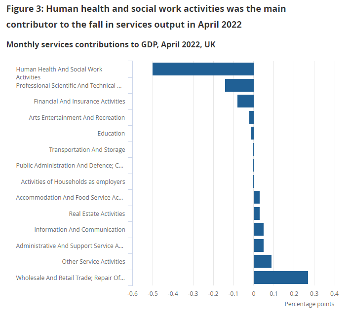 英國國家統計局指出,當月服務業下降了0.3%,這是4月GDP表現糟糕的主要拖累因素。繼今年3月下降0.2%之後,英國服務業4月連續第二個月出現了負增長。英國國家統計局稱,“人類健康和社會工作活動下降了5.6%,這是4月份服務業下降的主要負面因素。”