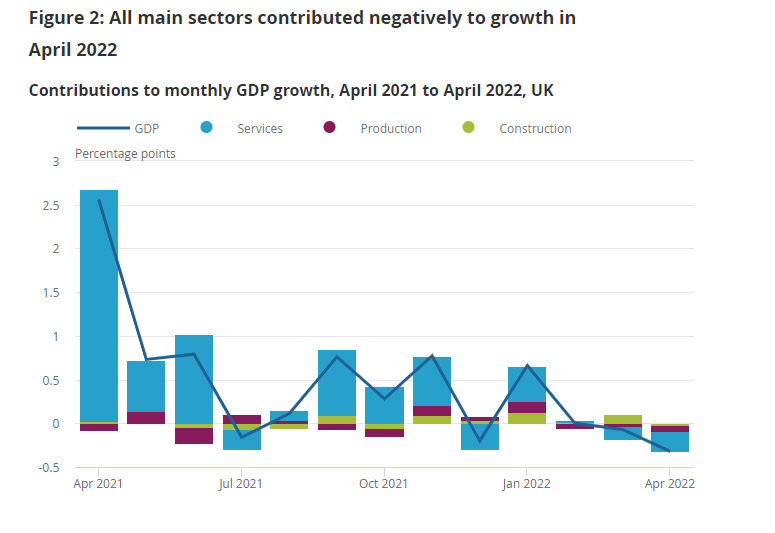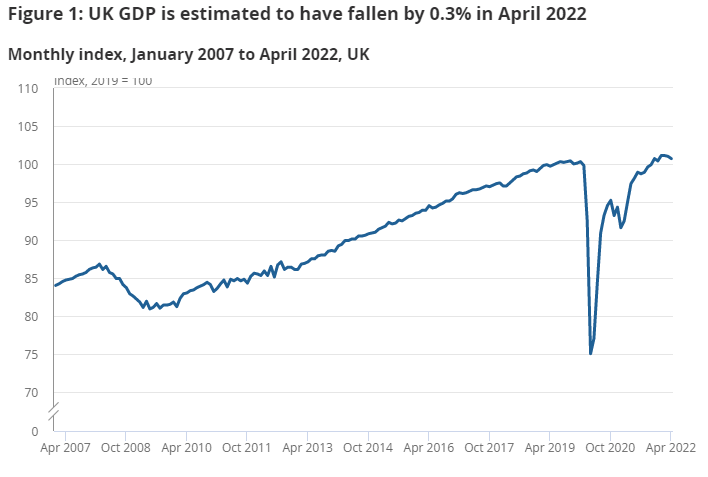 據英國國家統計局(ONS)6月13日公佈的數據,今年4月,英國國內生產總值(GDP)預計下降0.3%,遠遠低於經濟學家此前預測的增長0.1%。英國國家統計局稱,這是自今年3月以來,英國GDP連續第二個月下降。