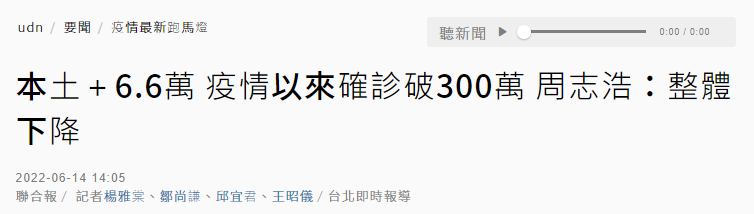 台疫情指揮中心統計,截至目前島內累計確診病例3003501例,其中本土確診病例2989912例,境外輸入病例13535例,36例敦睦艦隊、3例航空器感染、1例不明及14例調查中。2020年起累計4403例死亡病例,其中4388例本土病例,另有15例境外輸入病例。