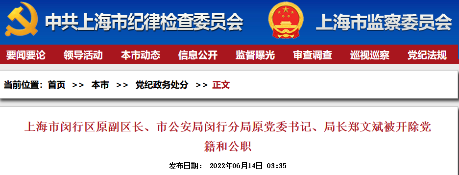 據上海市紀委監委網站消息,日前,經中共上海市委批准,上海市紀委監委對閔行區原副區長,市公安局閔行分局原黨委書記、局長,市公安局原一級巡視員鄭文斌嚴重違紀違法問題進行了立案審查調查。