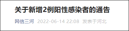 “網信三河”微信公眾號發佈關於新增2例陽性感染者的通告稱,6月14日,河北三河市在隔離點內檢出2例核酸檢測初篩陽性人員,均為北京推送的涉天堂超市酒吧聚集性疫情相關聯人員,鑑於當前疫情形勢,現將有關疫情防控工作通告如下: