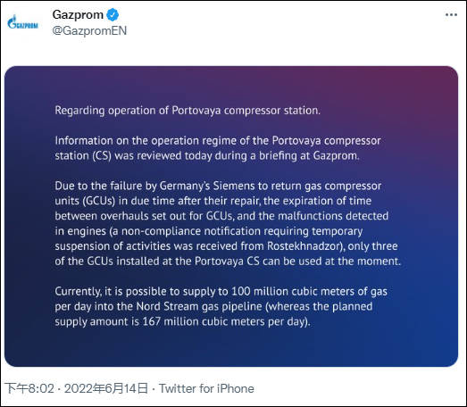 (觀察者網訊)當地時間6月14日,俄羅斯天然氣工業股份公司通過官方推特發佈消息稱,通過“北溪”天然氣管道的輸氣量可能將只保障在每晝夜約1億立方米左右的水平,與原計劃的每晝夜1.67億立方米輸氣量相比,下降近40%。
