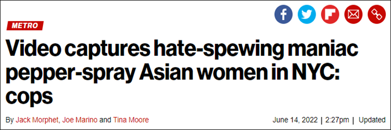《紐約郵報》:視頻捕捉到紐約一名仇恨者對亞裔女性噴胡椒噴霧