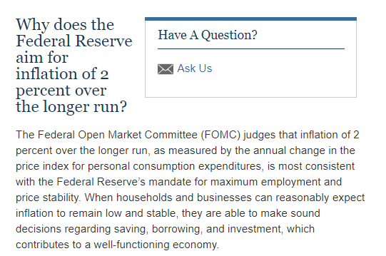 2020年8月,美聯儲宣佈將尋求2%的平均通脹目標。按照美國官方的説法,多年來美國的通貨膨脹率一直低於美聯儲2%的目標,而只有“2%的長期通脹率最符合美聯儲實現最大就業和物價穩定的使命。”