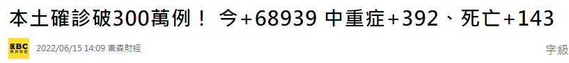 台灣流行疫情指揮中心15日公佈,台灣地區新增68965例確證病例,其中本土病例68939例,境外輸入病例26例;另確診案例中新增143例死亡。