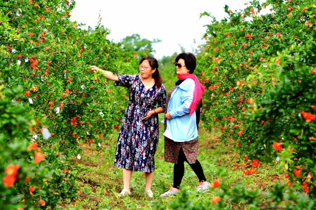 2021年6月,遊客在淅川縣南水北調中線工程渠首附近的石榴園裏觀賞石榴花。(淅川縣委宣傳部供圖)