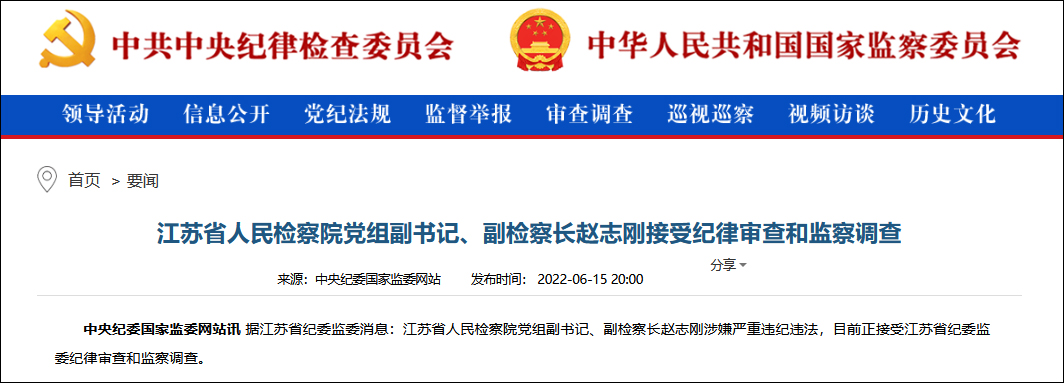 中央紀委國家監委網站15日消息,據江蘇省紀委監委消息:江蘇省人民檢察院黨組副書記、副檢察長趙志剛涉嫌嚴重違紀違法,目前正接受江蘇省紀委監委紀律審查和監察調查。