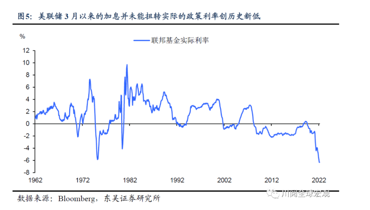 正是因為無意間引導了實際利率的下行,美聯儲3月以來的加息並未能起到抗通脹的效果。而為了糾正這一政策失誤,美聯儲本次會議在加息75bp的同時,也讓通過暗示年內繼續大幅加息,將2022年名義政策利率預測的上修了1.5個百分點至3.4%,大幅高於通脹上修的0.2個百分點,從而引導實際利率上行1.3個百分點。