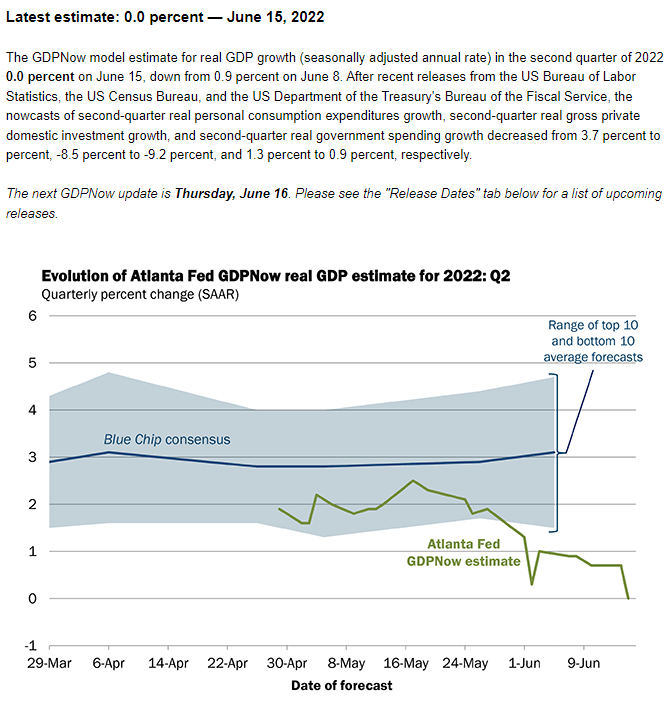 美國亞特蘭大聯儲GDPNowcast模型最新預計顯示,美國第二季度經季調後的GDP年化增長率為0%,相比於6月8日的0.9%出現大幅下降。這意味着美國或將面臨連續兩個季度的GDP下降。