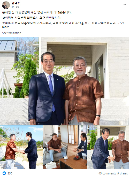 韓德洙拜訪文在寅後在臉書發文表示,“在平山村我們就日常生活、嚴峻的國內外經濟狀況、烏克蘭局勢等進行了交談。作為總理,我拜訪前總統旨在聽取施政相關建議。我請求文在寅前總統為新政府施政治國提供幫助,文在寅也給予積極回應”。
