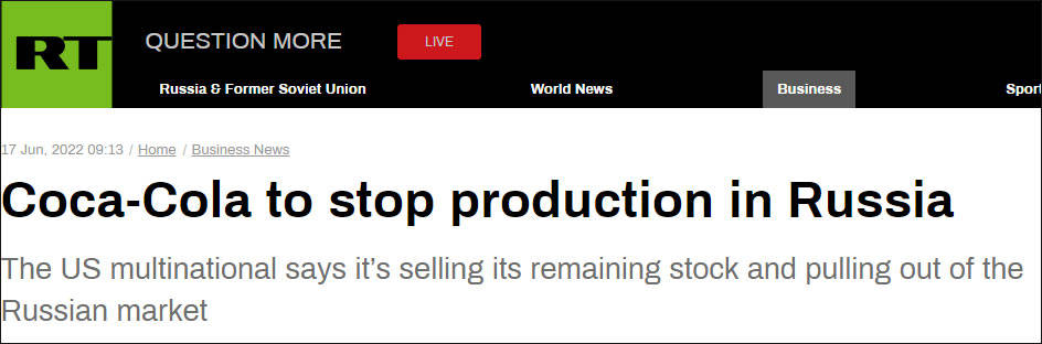 據報道,當地時間6月16日,可口可樂公司發表聲明稱,將“不再在俄羅斯生產或銷售可口可樂及公司的其它產品”。今年3月,可口可樂公司曾宣佈暫停在俄羅斯的業務。