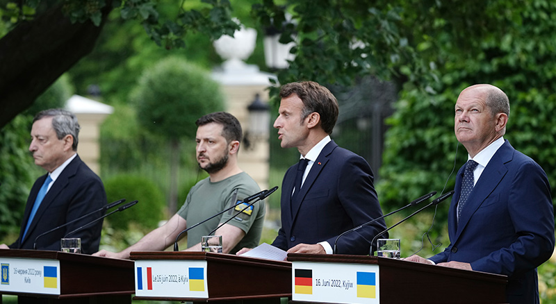 意大利總理馬里奧·德拉吉、烏克蘭總統澤連斯基、法國總統埃馬紐埃爾·馬克龍和德國總理奧拉夫·舒爾茨。圖自美聯社
