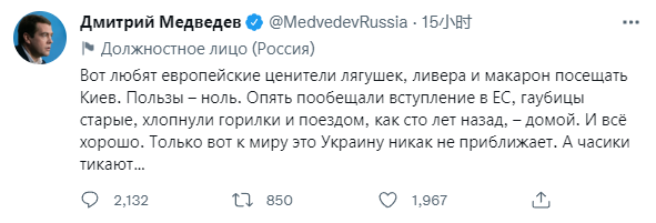 針對歐洲領導人訪問基輔,俄聯邦安全會議副主席梅德韋傑夫在推特上發文,稱這次訪問“一點用都沒有,不會讓烏克蘭更接近和平”。