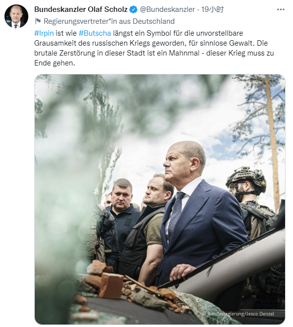 “這座城市中殘酷的破壞是一種紀念——這場戰爭必須結束。”舒爾茨探訪伊爾平後,在推特上這樣寫道。