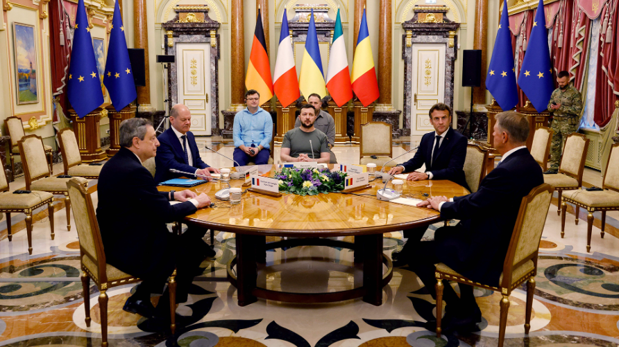 意大利總理馬里奧·德拉吉、德國總理奧拉夫·舒爾茨、烏克蘭總統澤連斯基、法國總統埃馬紐埃爾·馬克龍和羅馬尼亞總統克勞斯·約翰尼斯。圖自CNN