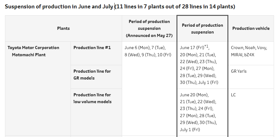 豐田再減產4萬輛汽車,6月全球產量將降至75萬輛 豐田公告局部截圖