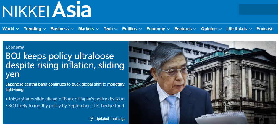 日本央行6月17日發佈決議:繼續寬鬆 日經亞洲報道截圖