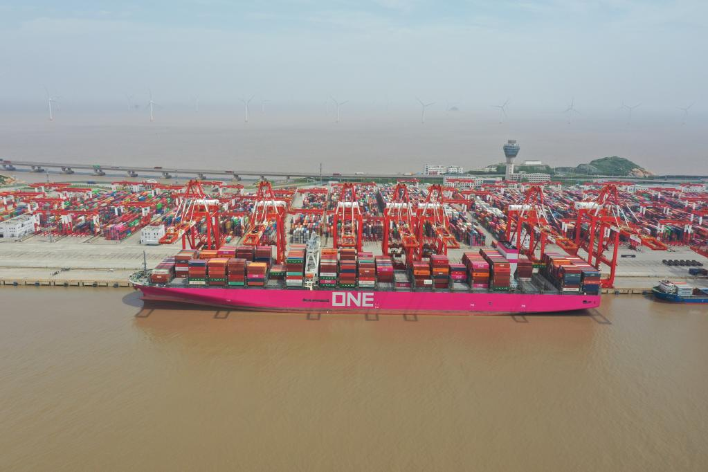 在洋山深水港靠泊裝卸的大型遠洋貨輪 新華社圖