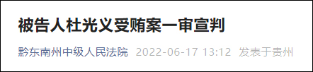 據“黔東南州中級人民法院”微信公眾號消息,2022年6月17日上午,貴州省黔東南州中級人民法院一審公開宣判貴州茅台股份有限公司原副總經理、中國貴州茅台酒廠(集團)有限責任公司原董事、貴州茅台酒銷售有限公司原董事長杜光義受賄案,對被告人杜光義以受賄罪判處無期徒刑,剝奪政治權利終身,並處沒收個人全部財產;對杜光義受賄所得財物及孳息依法予以追繳,上繳國庫。