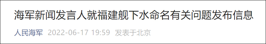 據“人民海軍”微信公眾號17日消息,海軍新聞發言人就福建艦下水命名有關問題發佈信息。
