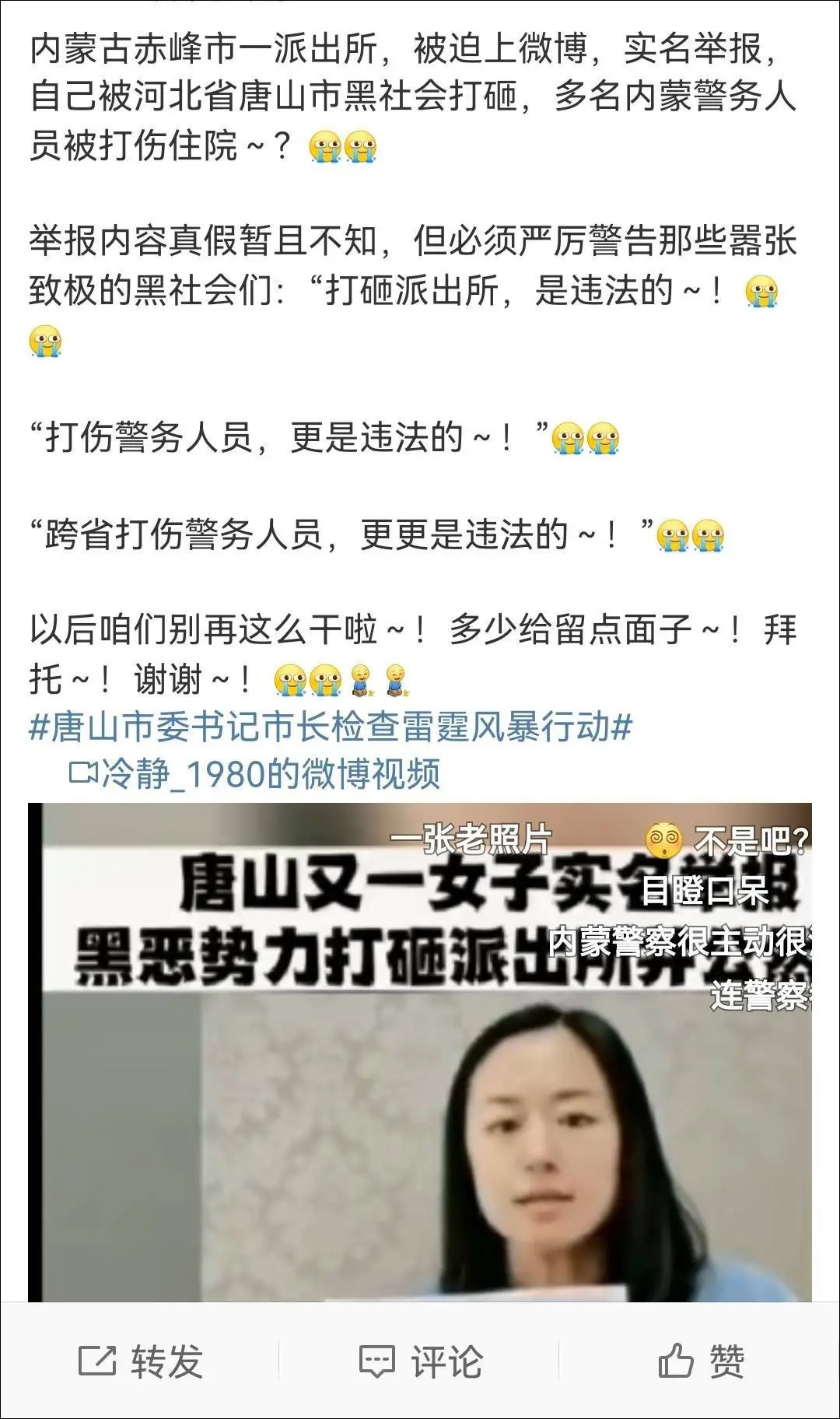6月15日,網絡上出現一段視頻,內容顯示,一名女子手持身份證,舉報唐山某鋼鐵集團董事長帶人,於2011年打砸赤峯市寧城縣某派出所,導致辦公用品損毀,3名民警受傷。